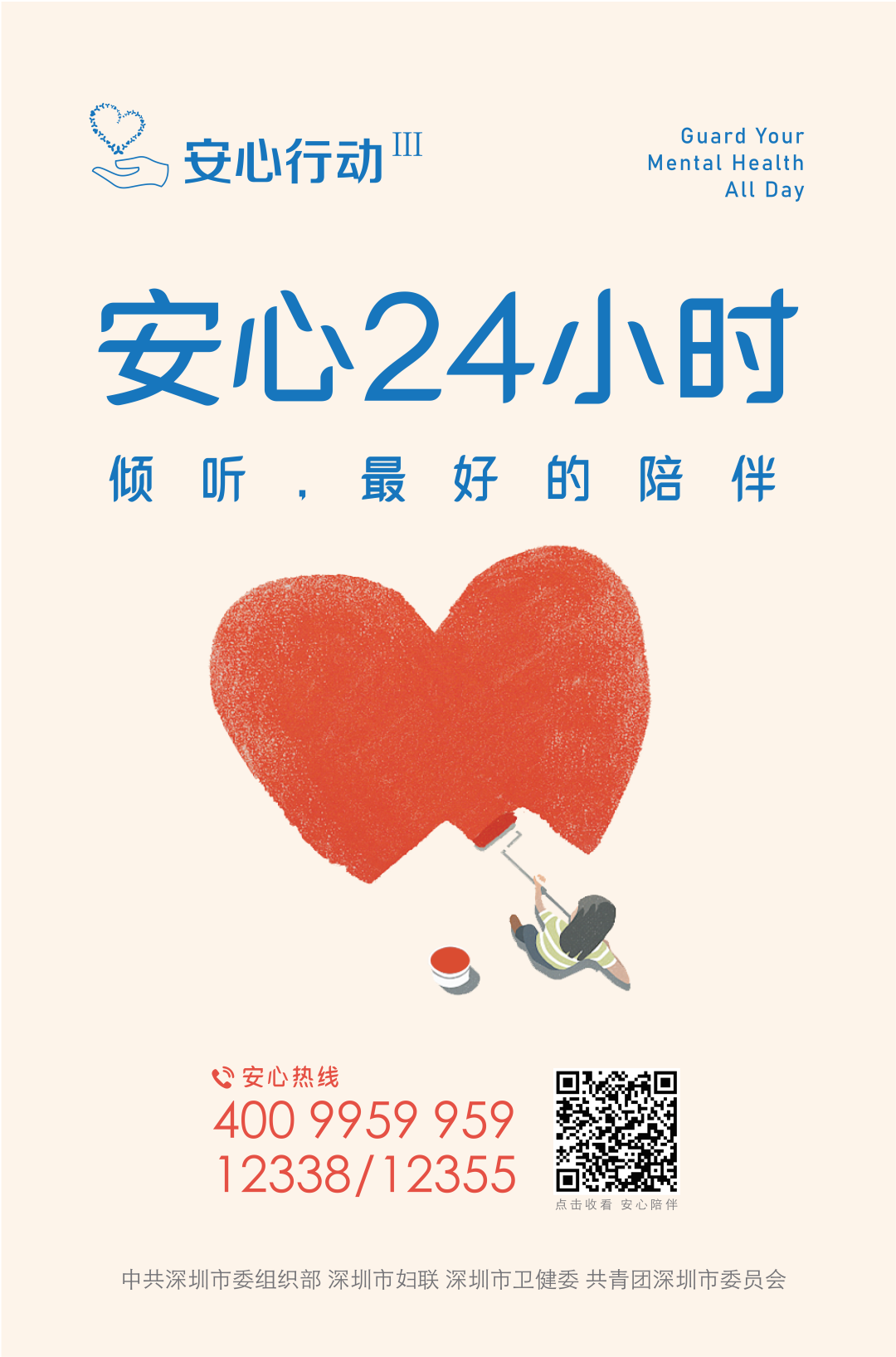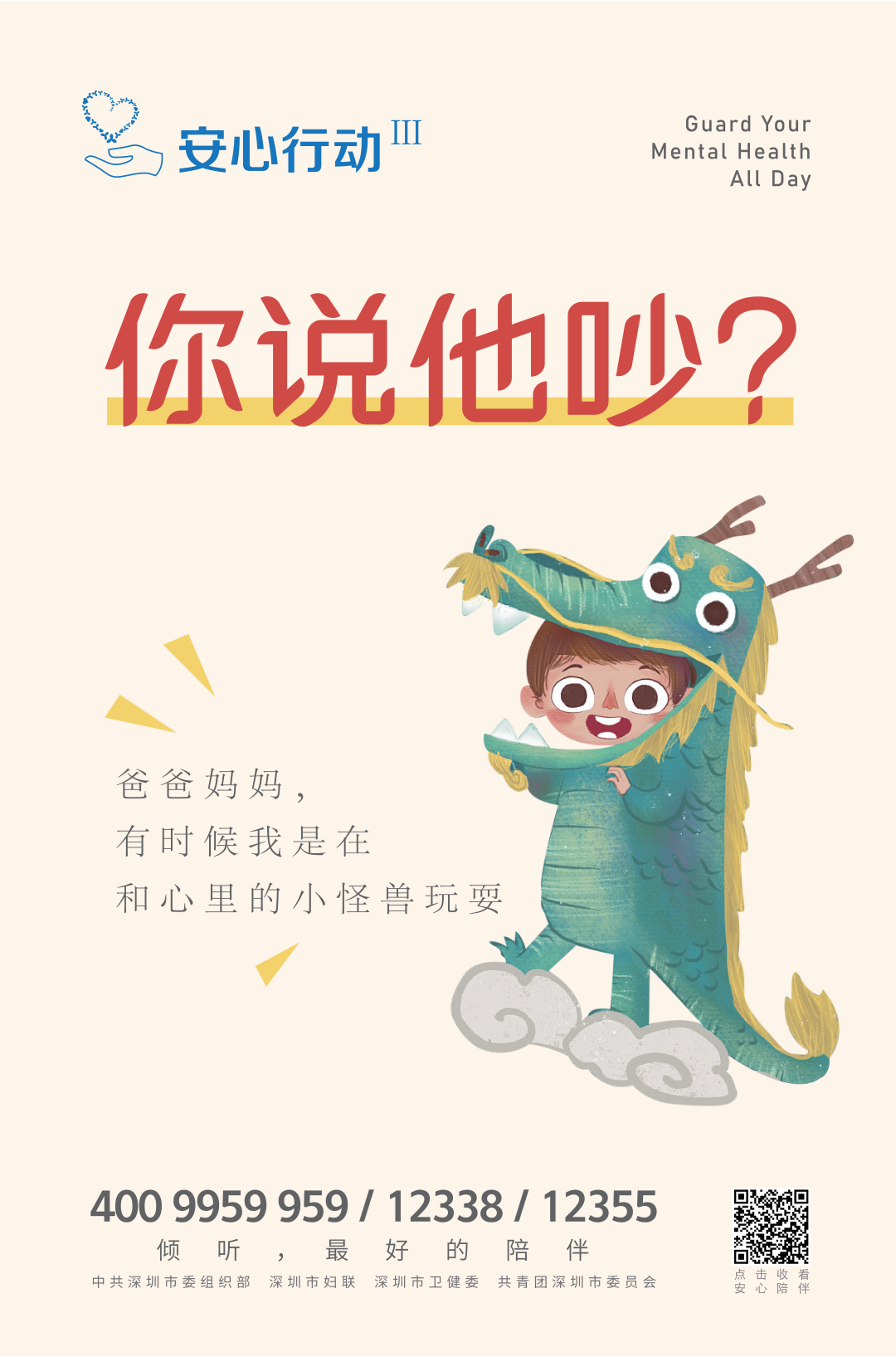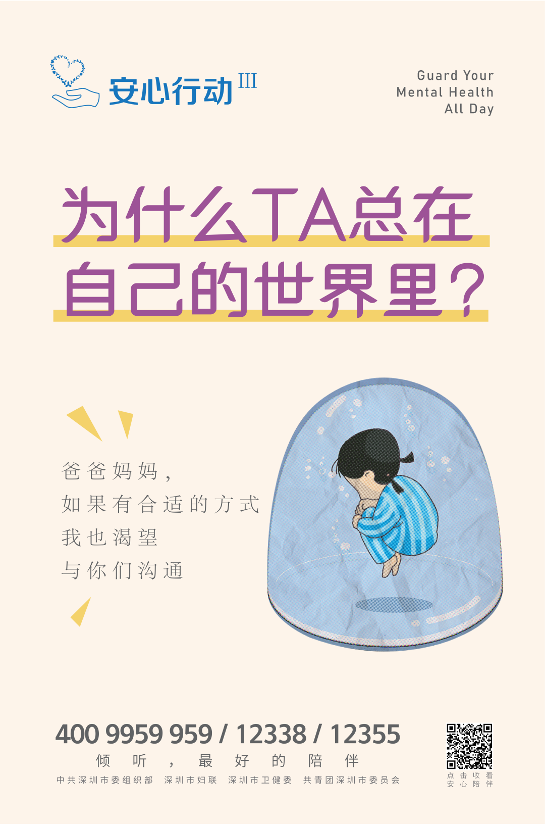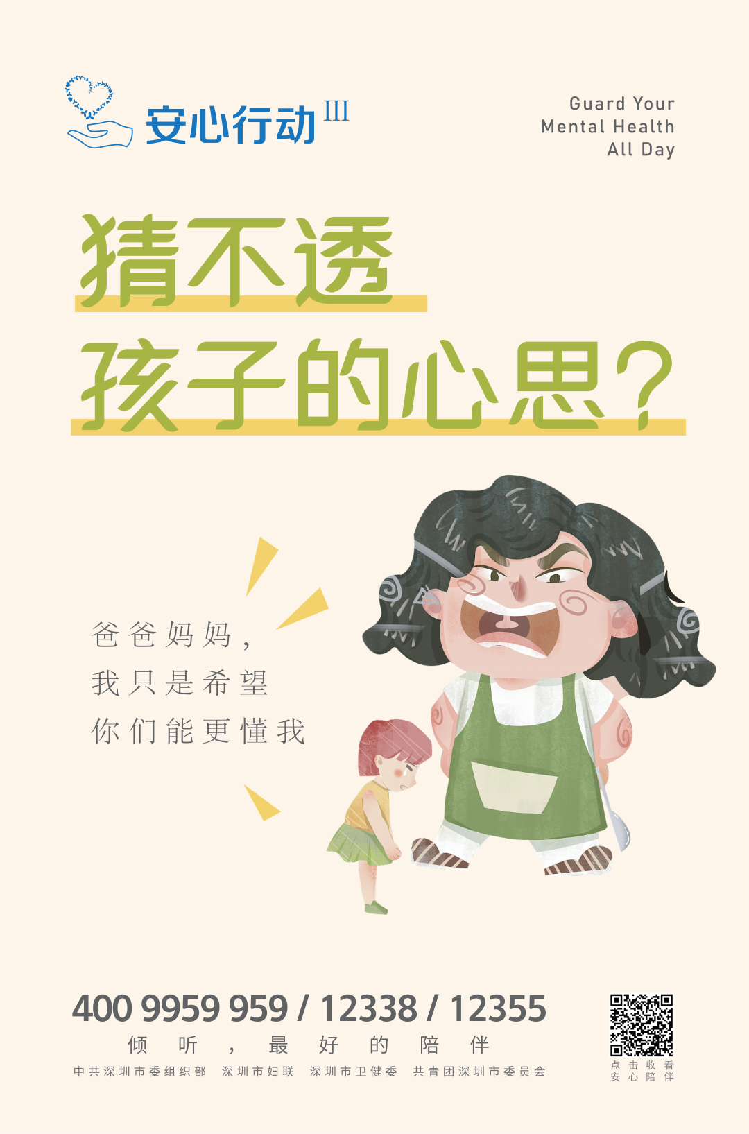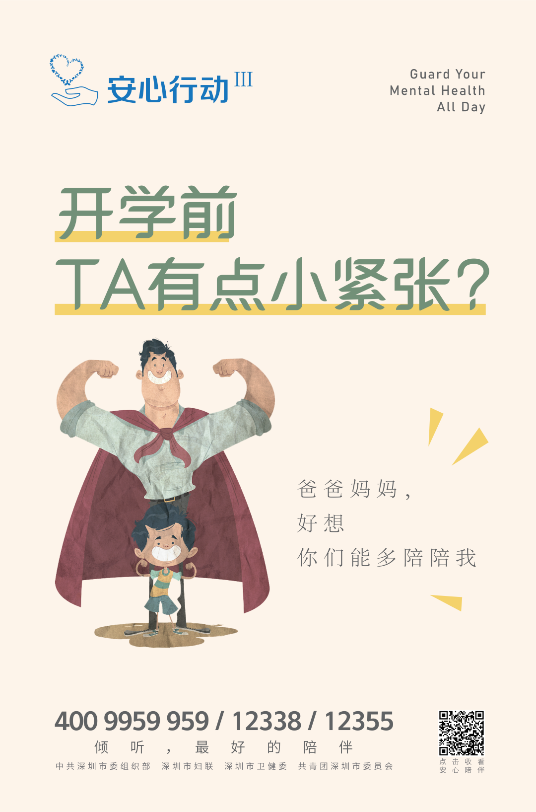 有需要的家长和同学们,都可以直接拨打4009959959、12338、12355接通“安心热线”。此外,还可以通过扫描海报二维码聆听“安心陪伴”音视频专辑,让专家为您出谋划策。